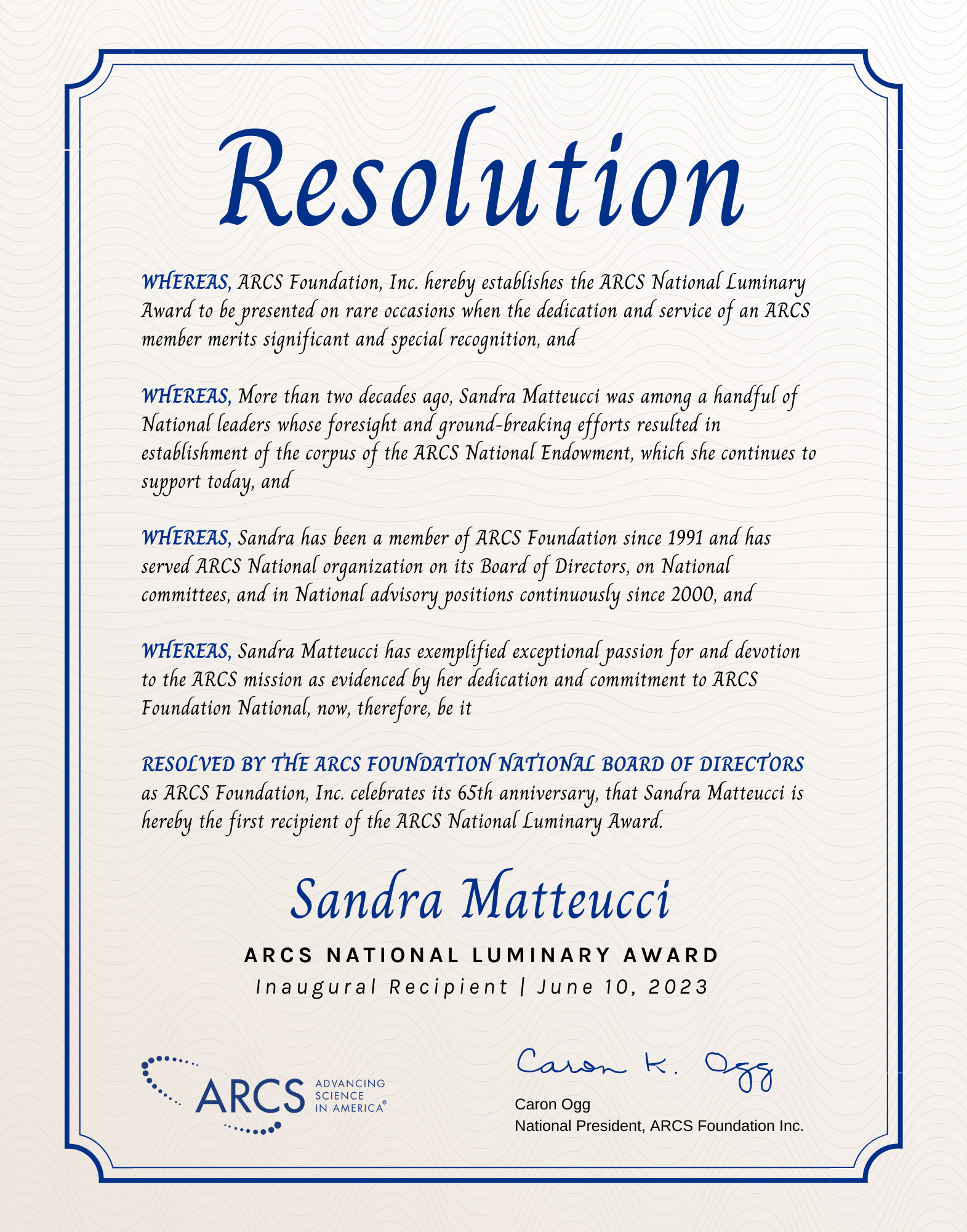 On June 10, 2023, ARCS Foundation National presented longtime member Sandra Matteucci with the inaugural Luminary Award. The award is a special, discretionary award that represents the highest recognition for service to ARCS National.