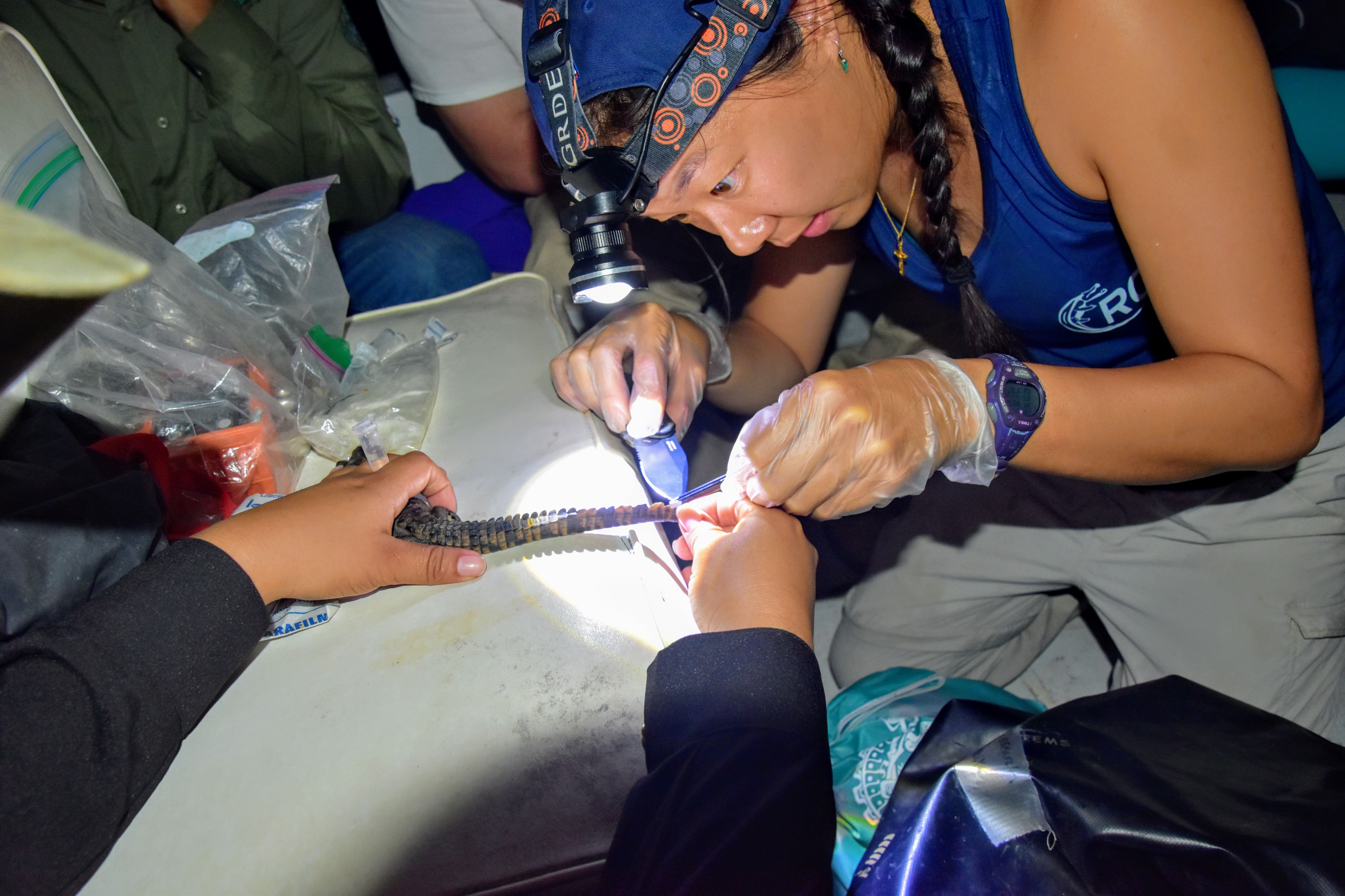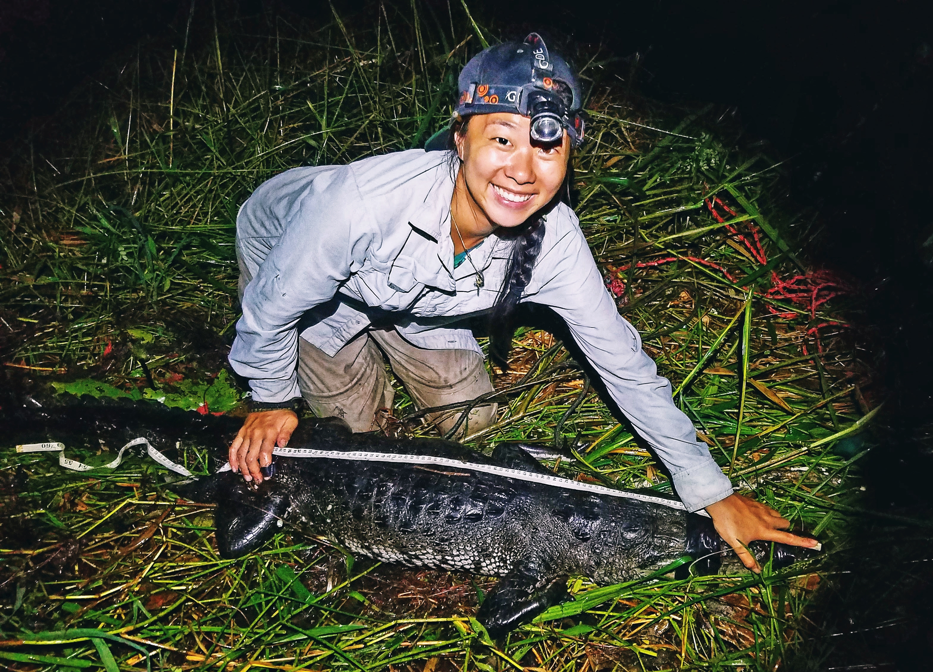Sung has captured crocodiles up to twelve feet long. She admits handling crocodiles makes her feel “adventurous,” but explains that it takes a team to collect samples from the reptiles. One person secures the mouth, then holds the crocodile’s mouth on their chest to prevent a “rolling” escape attempt. Another person secures the tail. “You can’t work with crocodiles by yourself. You have to work as a team and you have to trust your team because quite literally, your life depends on it,” she says.