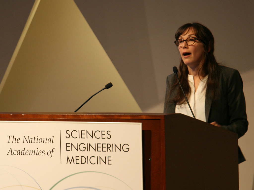 | Chelsea Rochman delivering the 21st Roger Revelle Commemorative Lecture on the science of plastic pollution, how plastic pollution has become a major issue on the policy stage, and what is being done to address the problem around the world. Photo credit: National Academy of Sciences |