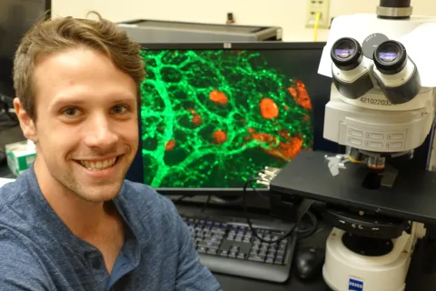 That quest led him to Dr. Kevin Wright’s lab at the Vollum Institute at OHSU, where he is using genetic tools to better understand how the exquisitely specific connections between brain cells (called synapses) form. Ultimately he would like to use insights gained from laboratory studies to improve our understanding of how specific symptoms arise in patients with rare genetic diseases that disrupt brain connections.