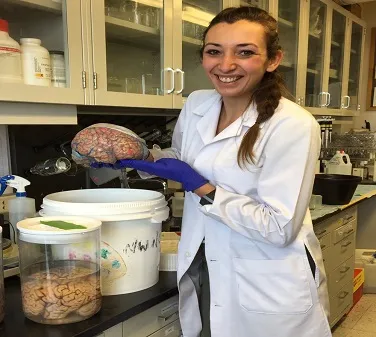 I am really excited about identifying a genetic risk factor for Alzheimer’s disease. Apolipoprotein E (apoE) is the strongest indicator for developing late-stage Alzheimer’s; people with apoE4 are more likely to develop the disease than people with apoE3 or apoE2. One of my current projects is looking at differences in brain activation based on apoE genotype. I’ve had the opportunity to use incredibly high-powered microscopes and fluorescent labeling to observe beautifully glowing brains!